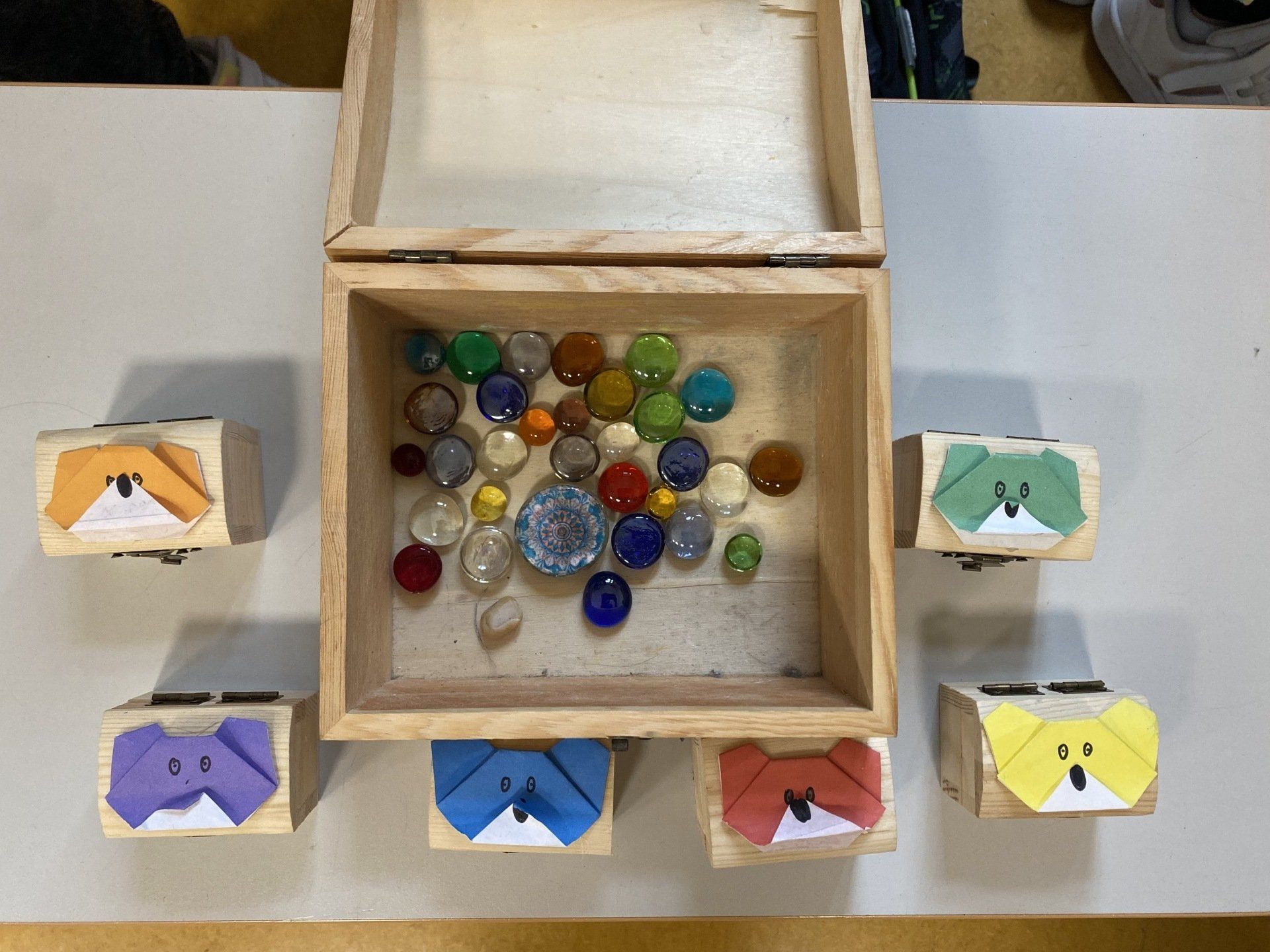 Damit Frau Tzannis nicht immer vergisst uns einen Stempel fürs gute Arbeiten zu geben, haben wir eine Kiste gemacht, die nun immer an der Tafel steht! Jetzt kann sie es endlich nicht mehr vergessen!