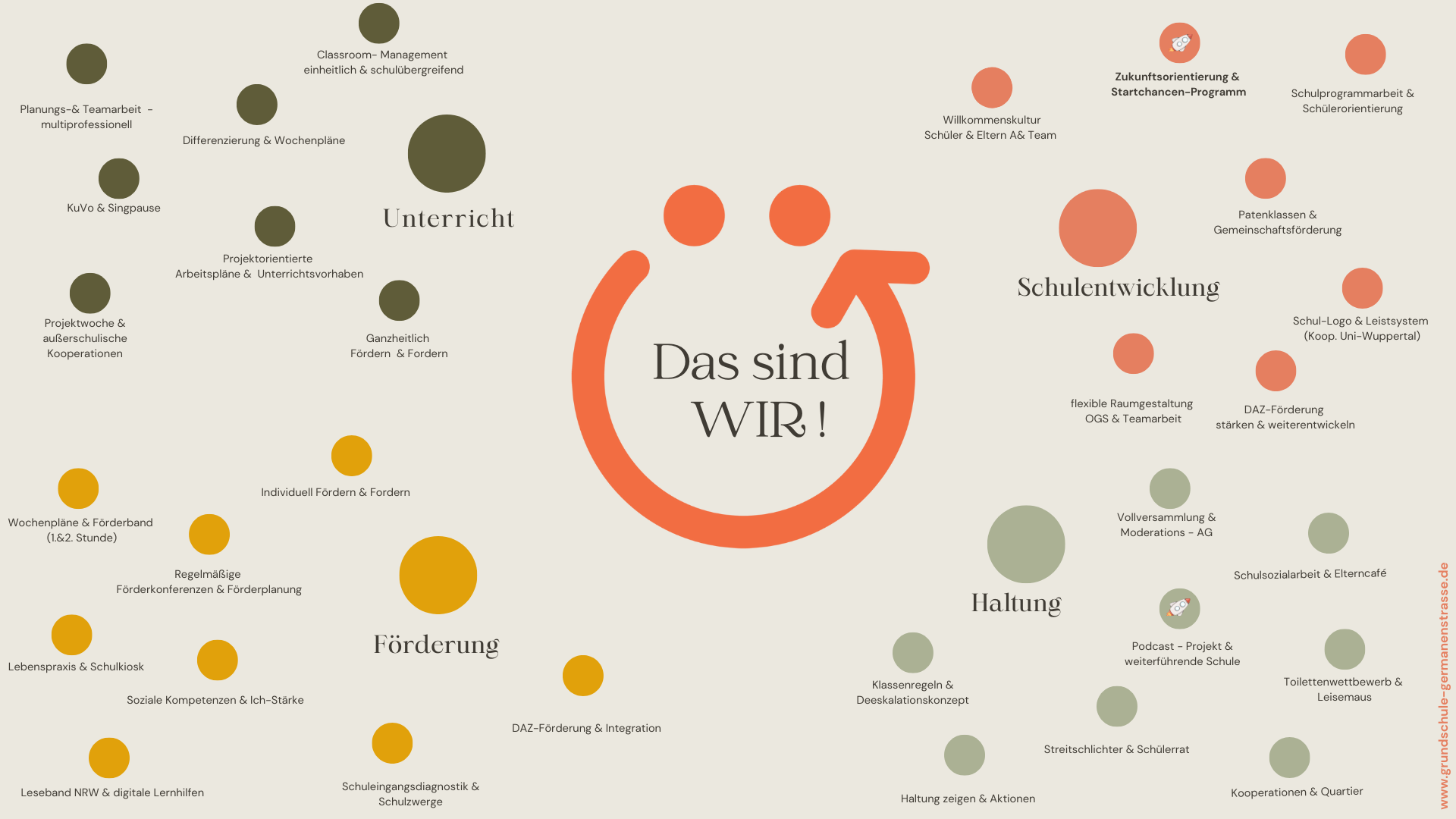 Gemeinsam mit der Uni Wuppertal ist unser Logo entstanden, das unsere positive Schulkultur und die Bedeutung der Gemeinsamkeit hervorheben soll. Auch das Leitsystem, das die Orientierung im Gebäude, gerade auch für unsere GL Kinder, erleichtert, ist im Rahmen dieser Kooperation entstanden. Wir lieben es!